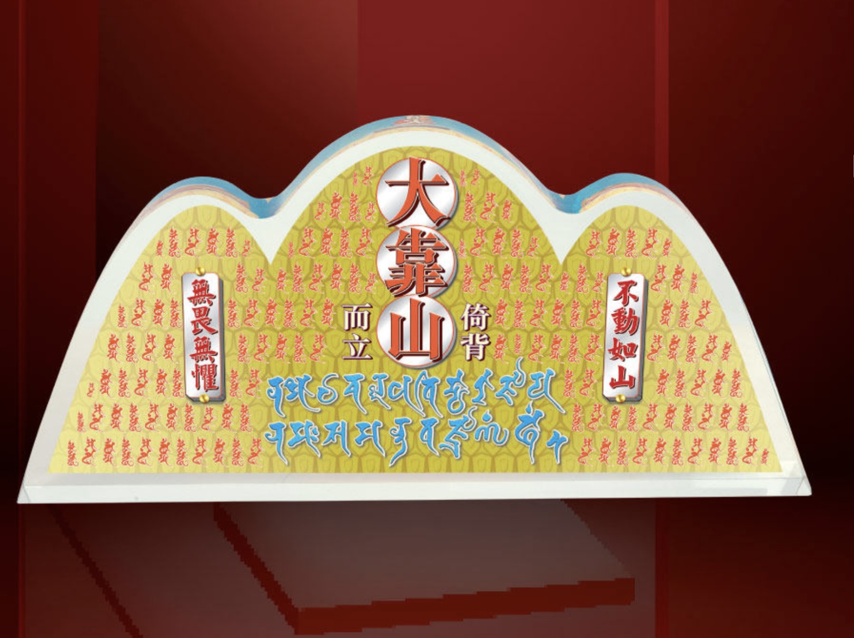 九運二十年多變化,原因是九運「火」當令,火是捉不住、站不穩的科幻年代,因此人人都需要有「不動如山」、「不驚不懼」,這是成功駕馭九運必要具備的智慧。誰最能駕馭火?就是密宗火供本尊「不動明王」。「大靠山」以密宗不動明王為守護本尊,背景是一百個不動明王梵文種子字和「南無不動明王」尊名。