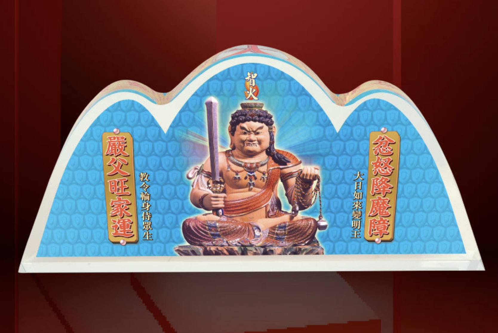 不動明王乃密教教主大日如來的教令輪身來執行任務,顯現忿怒相如父親的威嚴,以勇猛無畏的智慧去摧毀傷害眾生的種種阻力,獲得拯救和安心的加持。