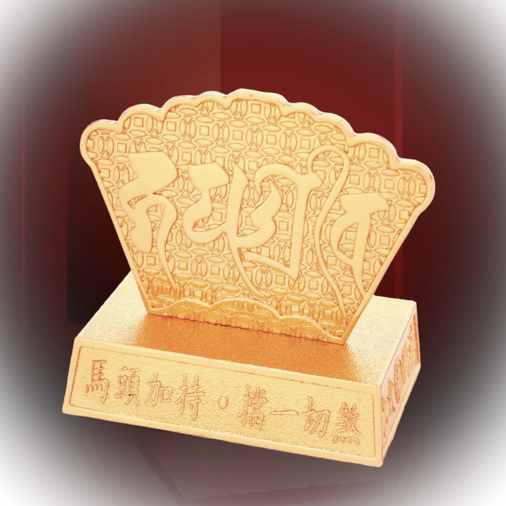 平安寶形態上是一個立體「如意頭」造型的盾牌,佈滿金色銅錢圖騰,用來