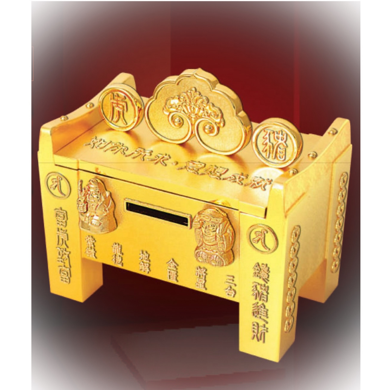 今年的大財箱是古財鼎造型。在下元八運中,鼎通常是三腳,但是現在要「四腳」了!原因是今年已進入九運鼎卦第五爻「執鼎耳」,代表要執起兩隻鼎耳,把鼎進行搬動,造成目今的世運都不穩定。所以我們就要用 「四腳鼎」來做我們的六合財箱,四平八穩,保住運勢和財運都穩如泰山 。內有「富貴天子虚空藏」菩薩梵文種子字加持人人開啟智慧,福智雙全。